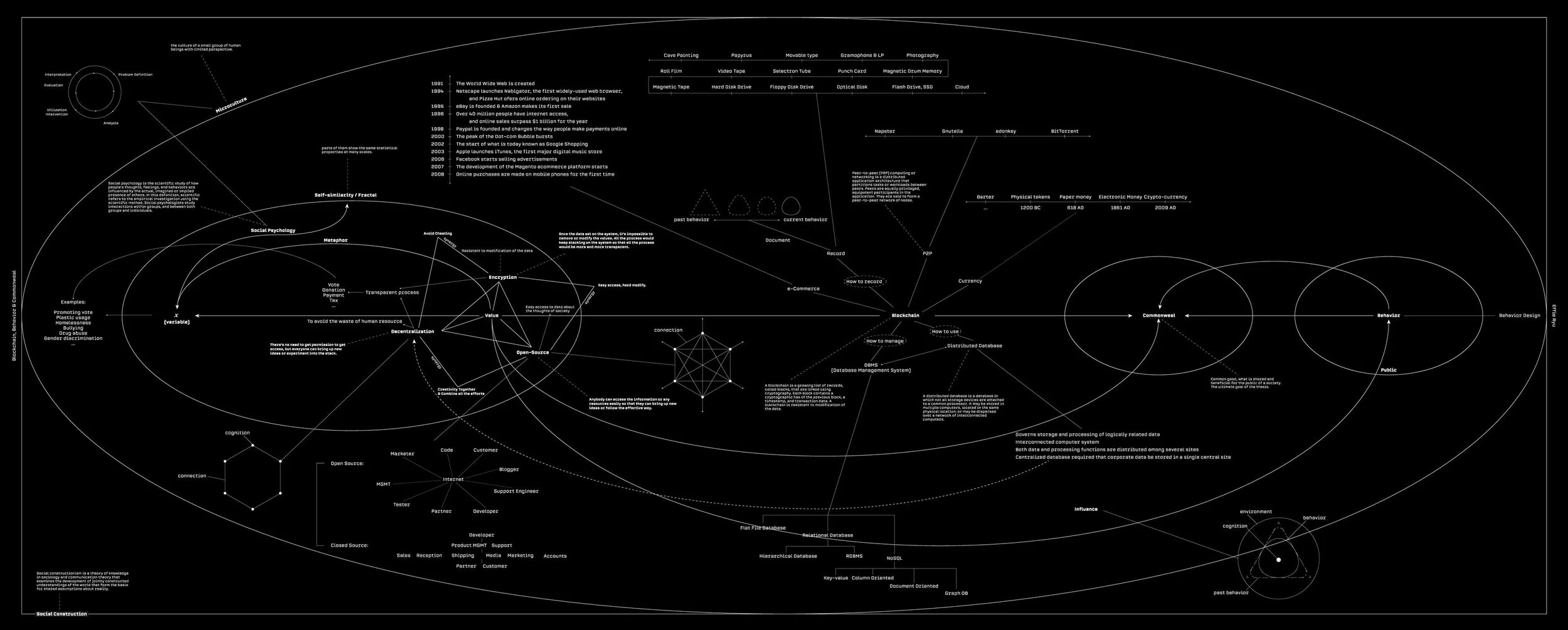 This map, a historical and contextual framework, focuses on the evolution of foundation technologies for Blockchain and highlights the principles of Blockchain as the key on this concept–encryption, decentralization, and open-source. The map shows the overall concept, and the data obtained from the research shows a certain correlation, showing the direction toward the goal–commonweal.